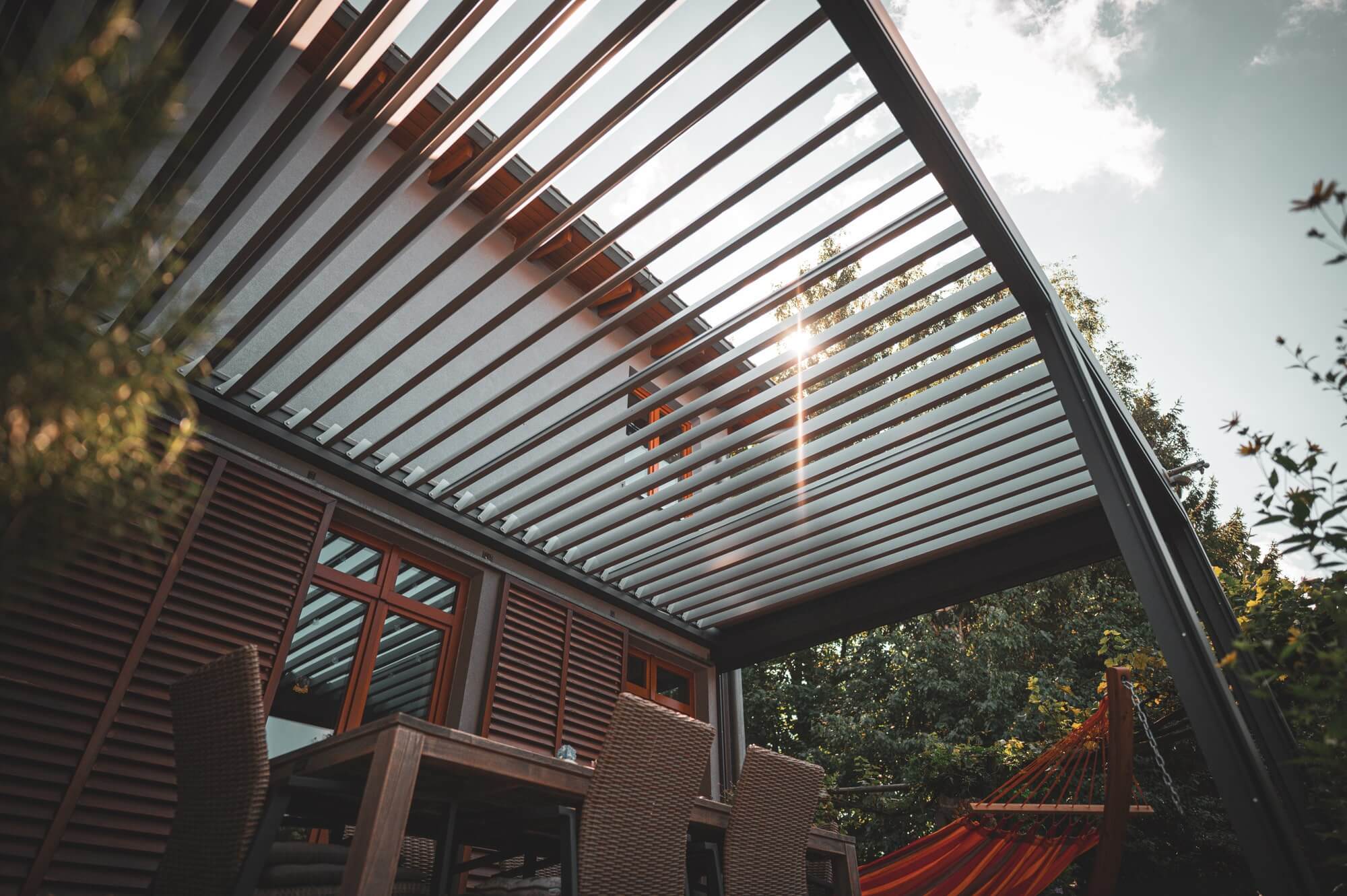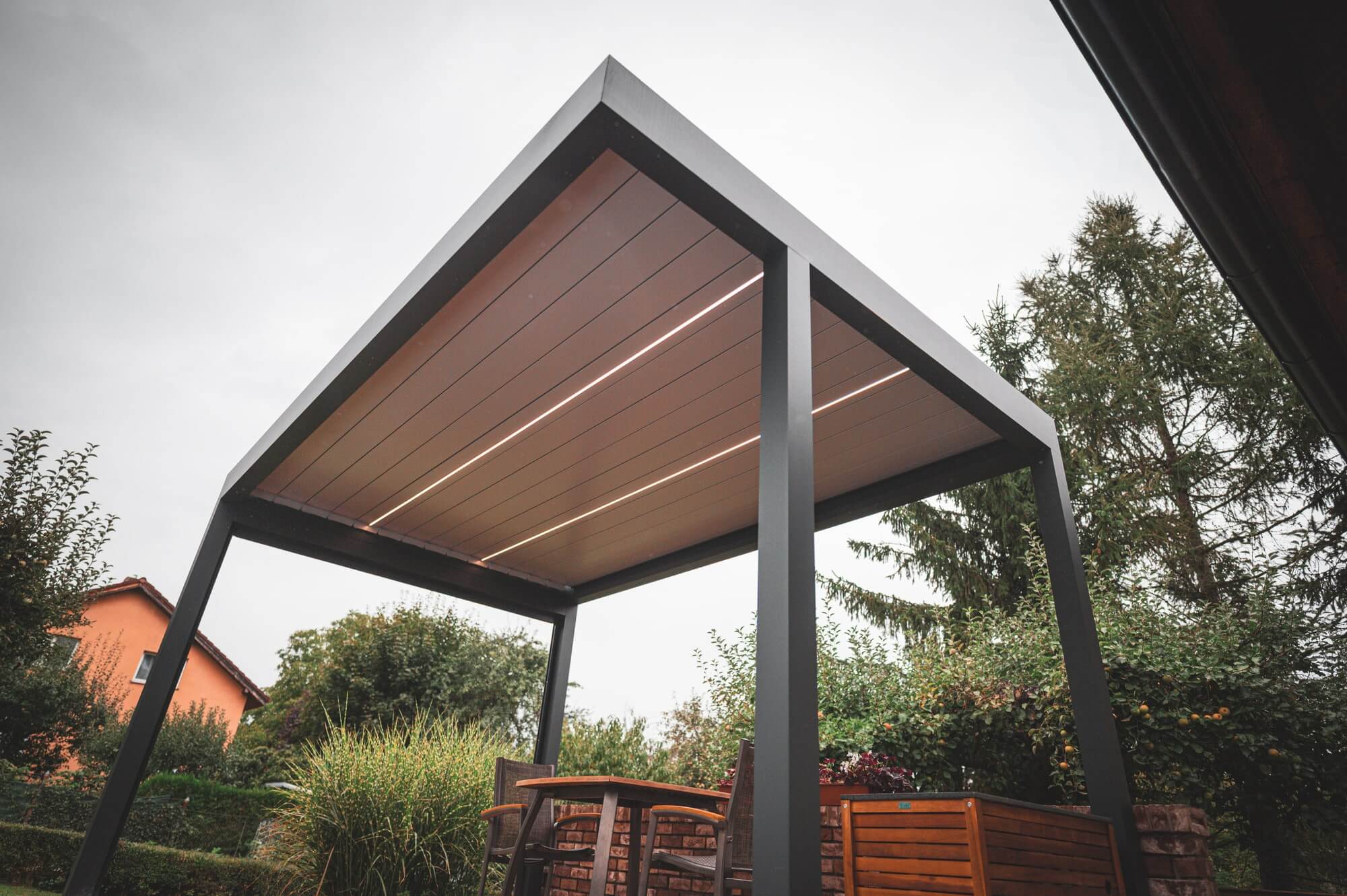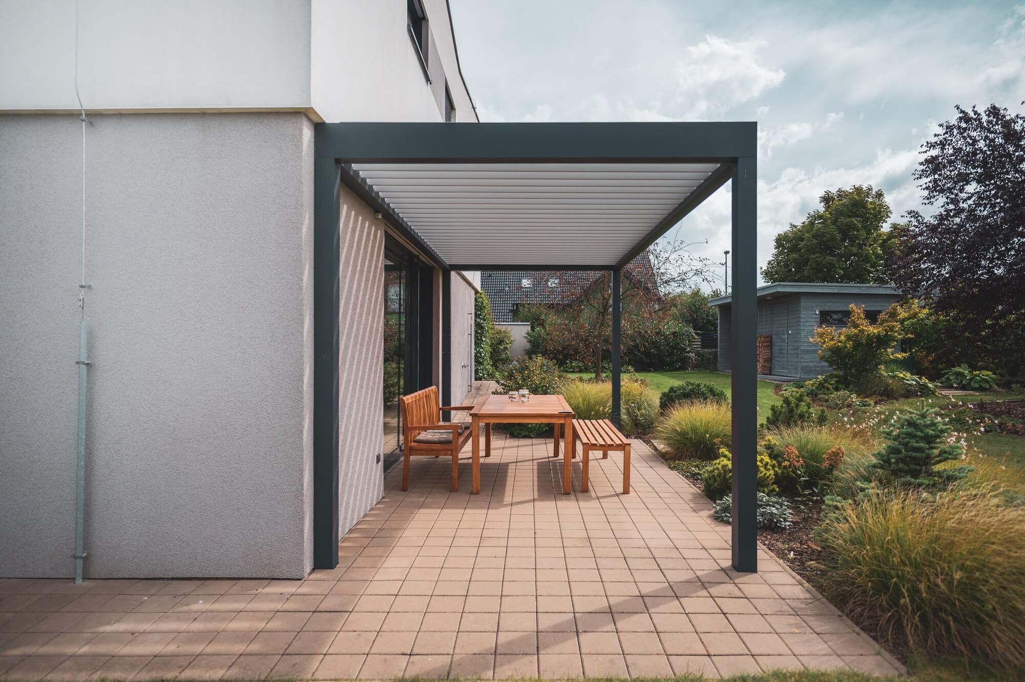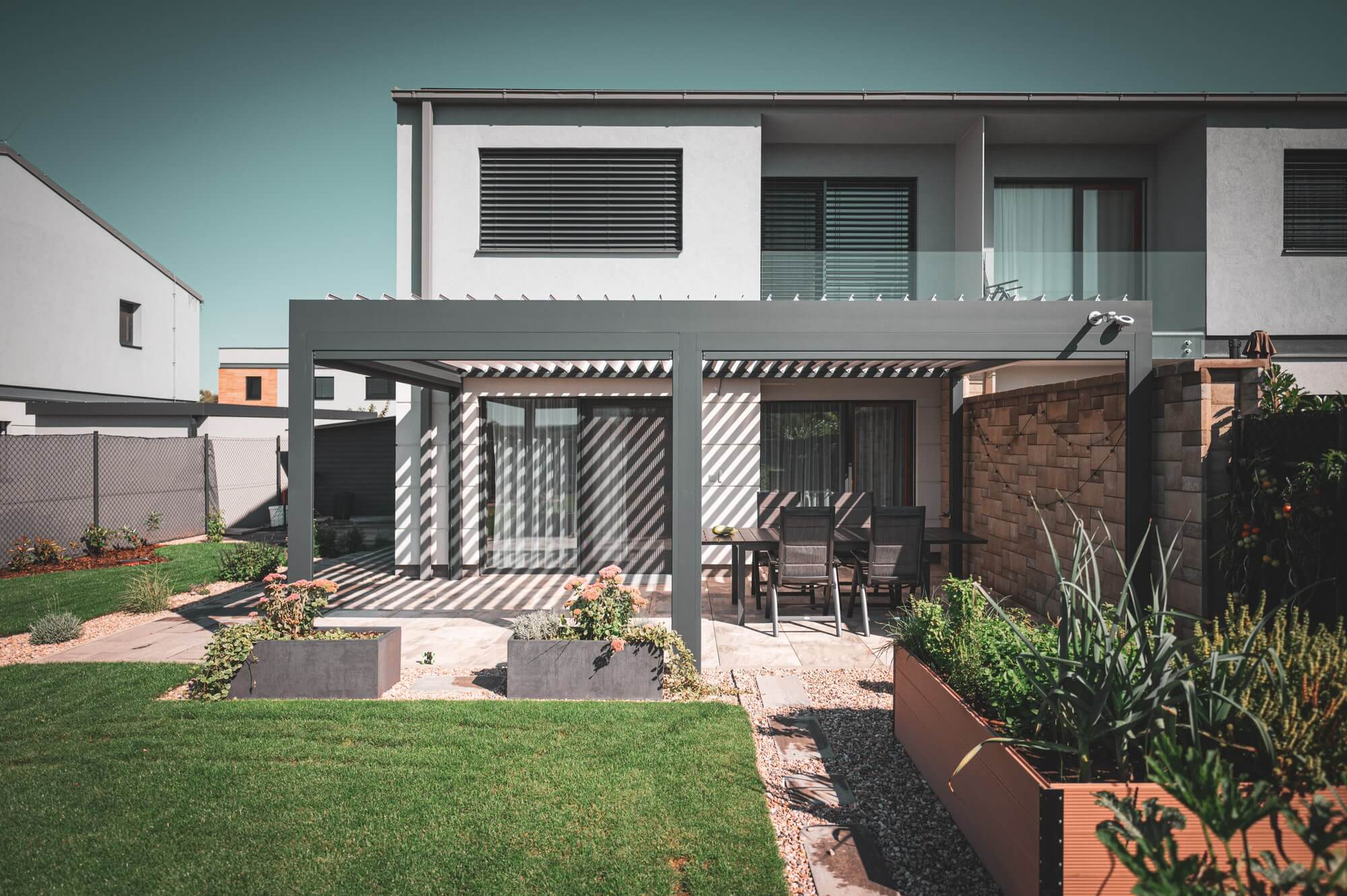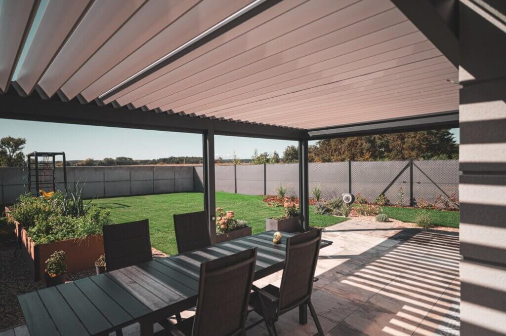 Hliníková pergola MM BIO má strechu tvorenú výklopnými lamelami, vďaka ktorým dosahuje úplnú odolnosť voči vode a zároveň nevídanú bioklimatickú funkciu, ktorá sa postará o príjemné chvíle na vašej terase. Pergola Meridiem ponúka veľa možností dodatočného príslušenstva, ako je bočné látkové tienenie, kompletné zasklenie, infračervené vykurovanie alebo senzory, ktoré pomáhajú chrániť váš záhradný nábytok pred dažďom. Ako domáci výrobca sme schopní splniť každú individuálnu požiadavku našich zákazníkov, či už ide o farbu, veľkosť alebo spôsob ukotvenia.
