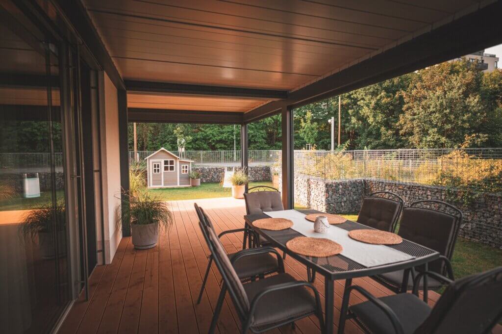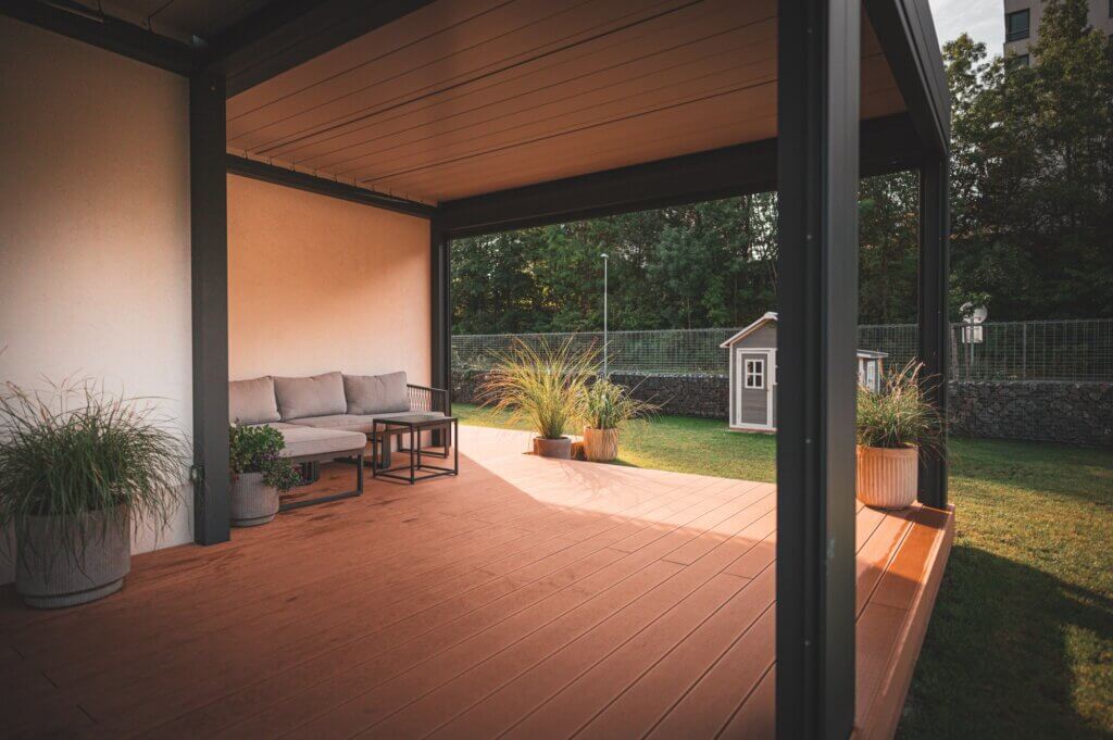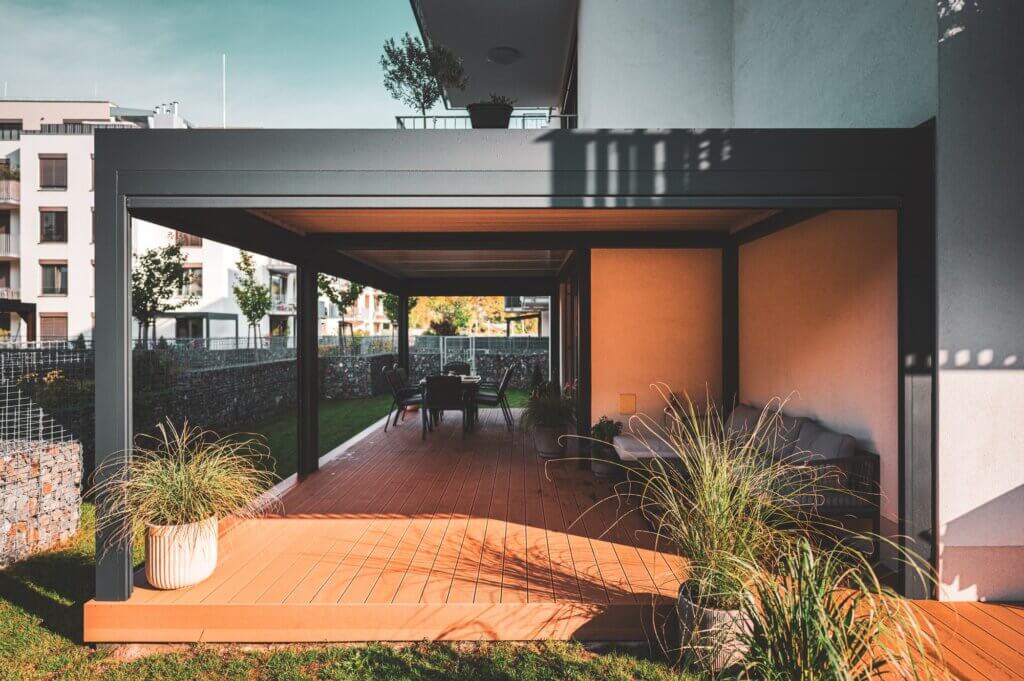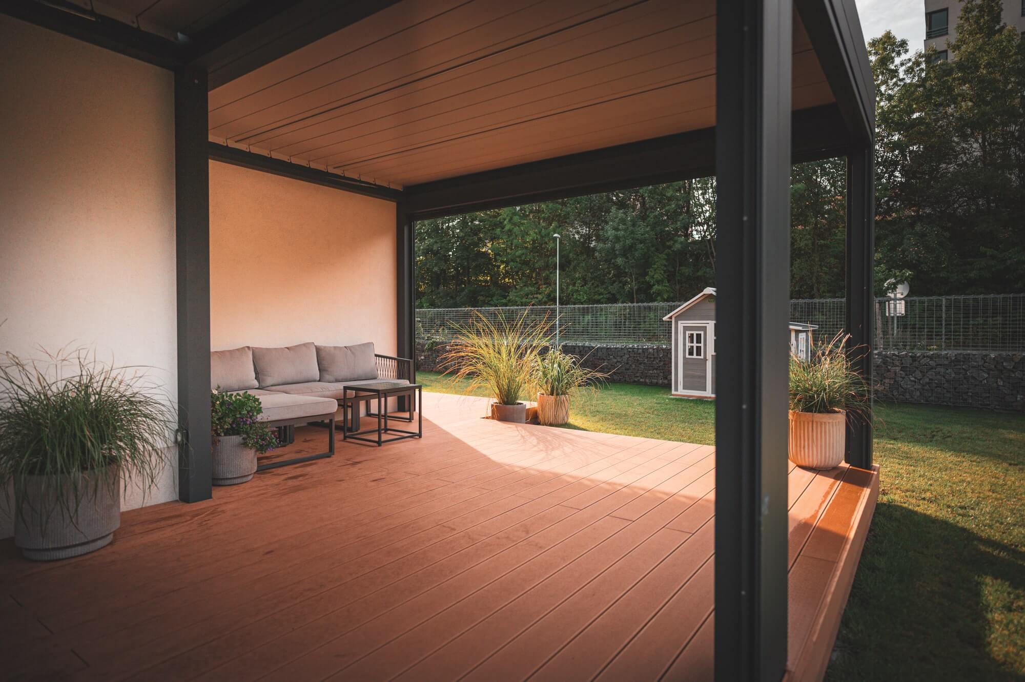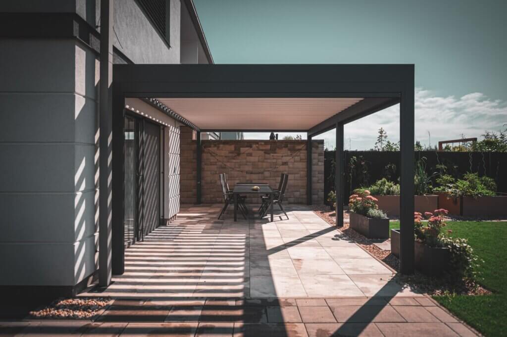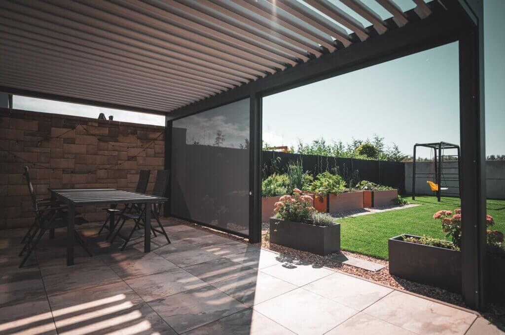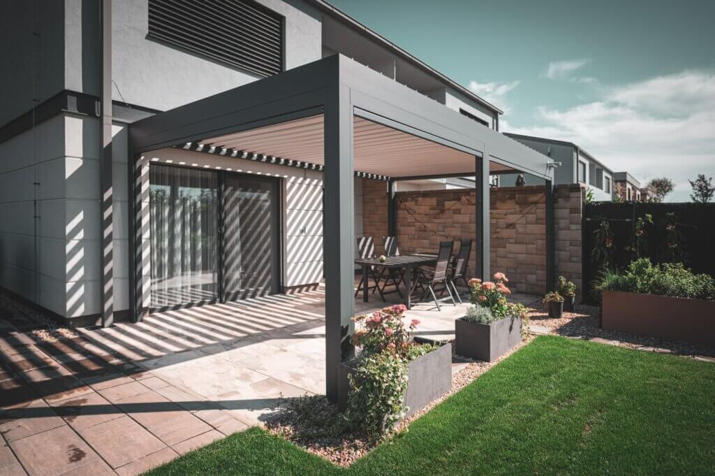 Hliníková pergola MM BIO má strechu tvorenú výklopnými lamelami, vďaka ktorým dosahuje úplnú odolnosť voči vode a zároveň nevídanú bioklimatickú funkciu, ktorá sa postará o príjemné chvíle na vašej terase. Pergola Meridiem ponúka veľa možností dodatočného príslušenstva, ako je bočné látkové tienenie, kompletné zasklenie, infračervené vykurovanie alebo senzory, ktoré pomáhajú chrániť váš záhradný nábytok pred dažďom. Ako domáci výrobca sme schopní splniť každú individuálnu požiadavku našich zákazníkov, či už ide o farbu, veľkosť alebo spôsob ukotvenia.